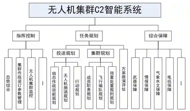 无人机集群C2系统从功能组成上包括指挥控制、任务规划、综合保障等三类功能,图2中列出了与无人机集群紧密相关的功能。