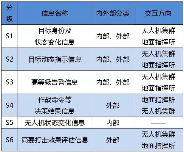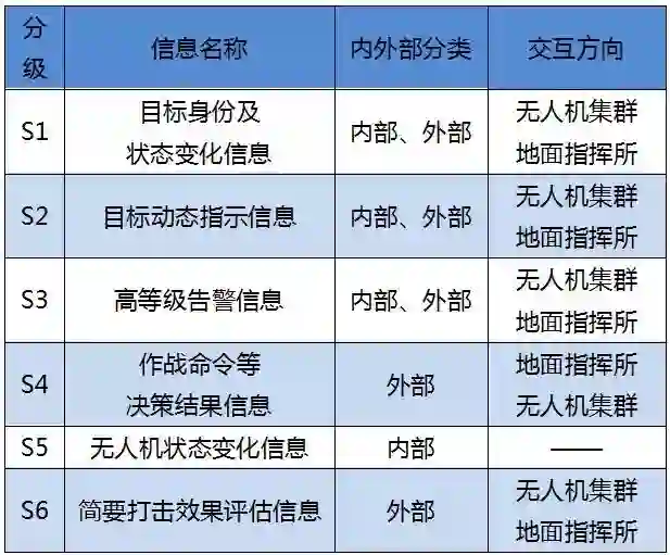 无人机集群作战是一种超视距作战,战场环境复杂,作战态势瞬息万变,作战时机稍纵即逝;无人机集群内部需要进行信息交互和共享,同时还需要与地面C2系统进行信息收发,所有这一切都使得担负决策和对外通信功能的无人机的负担较重。在上述情形下,就存在如何传递适当的信息以满足无人机集群作战的需要。如果传递的信息过少,则无人机集群或地面C2系统缺少对实时战场态势的必要掌握和了解,无法及时决策和指挥后续作战行动;如果传递的信息过多,则会加重通信载荷的负担,使无人机集群或地面C2系统不能做出及时反应,整个系统反映迟缓,错失战机,造成不可弥补的损失。这里提出无人机集群作战交互信息分级的概念。