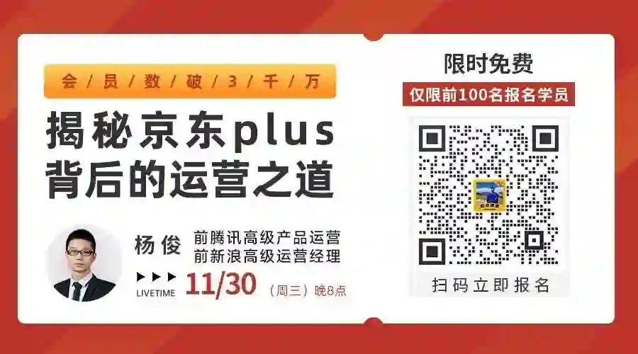 11月30(周三)晚8点,前腾讯高级产品运营@杨俊老师,将会以国内本土购物平台第一个付费会员体系——京东Plus会员为例,拆解其背后的运营增长逻辑,教你会员权益搭建的方法!