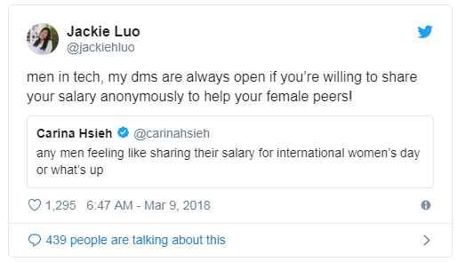 在国际妇女节那天,我在作家Carina Hsieh和#talkpay运动的启发下发表了如下推文,向科技界的男性发出公开邀请,与我分享他们的薪资,我可以匿名发布他们的情况。