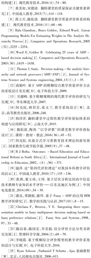 教学是一个很复杂的系统,由于影响教学的因素繁多,课堂教学的评价也显得异常复杂,翻转课堂也是如此。目前关于翻转课堂的评价还不是很成熟,其中具有代表性的有:李馨借鉴CDIO教学模式评价标准,从翻转课堂教学质量评价的理论基础、基本原则等方面提出了翻转课堂体系建设路线图,对进一步建构不同层次、不同学科内容的翻转课堂评价体系奠定了基础[5];张涛等将布卢姆教学目标分类理与Kirkpatrick评估模型相结合,从四个层次构建了翻转课堂学习绩效评价模型,并在问卷调查法和访谈法搜集数据资料的基础上,对该模型进行了实证研究[6];黄美初等通过对实施翻转课堂的24位教师和学生采用质性研究范式,运用半开放式访谈法进行深度访谈,对访谈内容进行分析,提取出影响翻转课堂教学的五个关键要素,即课程资源、学习评价、学习支持服务、学习者、课程教师,为进一步对翻转课堂的实证研究打下了基础[7];蒋立兵等以过程性评价、发展性评价以及表现性评价为理论基础,得出翻转课堂教学评价的本体特征和应然取向,构建了翻转课堂教学评价体系[8]。据文献分析发现,现有的翻转课堂教学评价主要集中在对评价因子的提取方面,考察翻转课堂的影响因素,侧重理论的思辨,而具体可操作性的评价方法还很少。本研究借助AHP-模糊矩阵,结合特尔斐法,建立了翻转课堂综合量化评价模型,设计切合教学实际的翻转课堂教学评价系统,力图为翻转课堂教学实践评价提供参考。