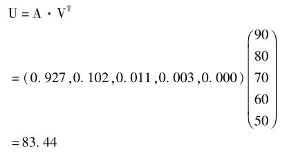 为了将一级评价指标集化成对应的百分制,本研究分别给评价等级“优秀”“良好”“一般”“合格”“较差”赋予90、80、70、60、50分,则评价等级参数矩阵为V=(90,80,70,60,50),因此,翻转课堂教学AHP-模糊矩阵综合评级结果就为: