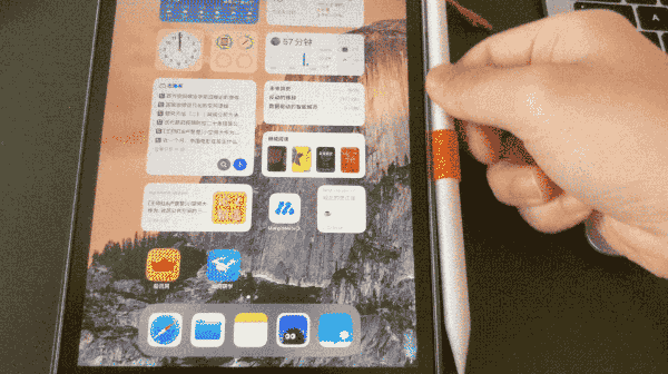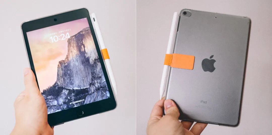 具体的方法是在 iPad mini 5 的背面右侧中间贴上粘贴式笔夹,将笔插入笔夹即可方便地携带,使用时将笔抽出即可。由于 iPad mini 5 的侧边也有磁吸的材质,虽然无法直接牢固吸附手写笔,但是在笔夹的帮助下手写笔可以贴在 iPad mini 5 的侧边,不会因为重量下坠。