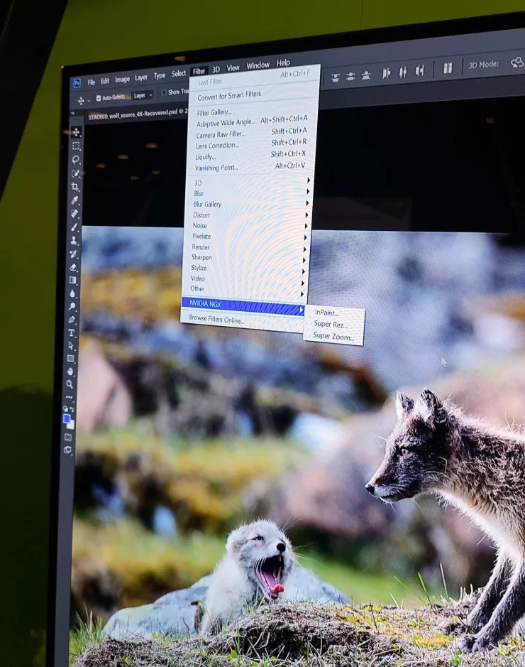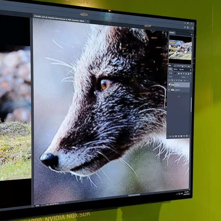 Super Rez的主要功能是为图像添加更逼真的细节。如图所示,狼群站立在山腰上,其毛发细节逼真,树叶纹理清楚,放大后也很清晰,分辨率能达到4K至8K。这个功能对于大幅高清图像很适用,例如大幅面海报。从现场演示来看,这项功能大概需要10分钟。