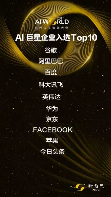 2017年,科技巨头们继续开放AI技术平台,开源深度学习框架,搭建AI云赋能中小企业,推动AI民主化的历史进程。在中国新一代人工智能规划出台、各国政府将AI定为国策的背景下,多家企业巨头以All In AI的决心,全面布局AI,并深入垂直领域的智能+探索。60载沉浮之后,人工智能进入“应用元年”,AI巨星企业无疑是这场深刻产业变革的引领者和中坚力量。AI World 2017世界人工智能大会 “AI 奥斯卡”巨星企业Top 10分别是:谷歌、阿里巴巴、百度、科大讯飞、英伟达、华为、京东、Facebook、苹果、今日头条。