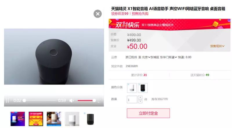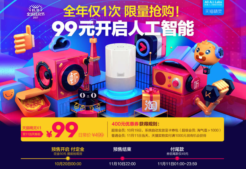 在双 11 开始前,我们发现阿里人工智能实验室下原价 499 元的天猫精灵 X1 ,居然变成了“领券后 99 元”!99 元这个价格意味着什么呢?可以说从单个音箱来说不可能收回成本。