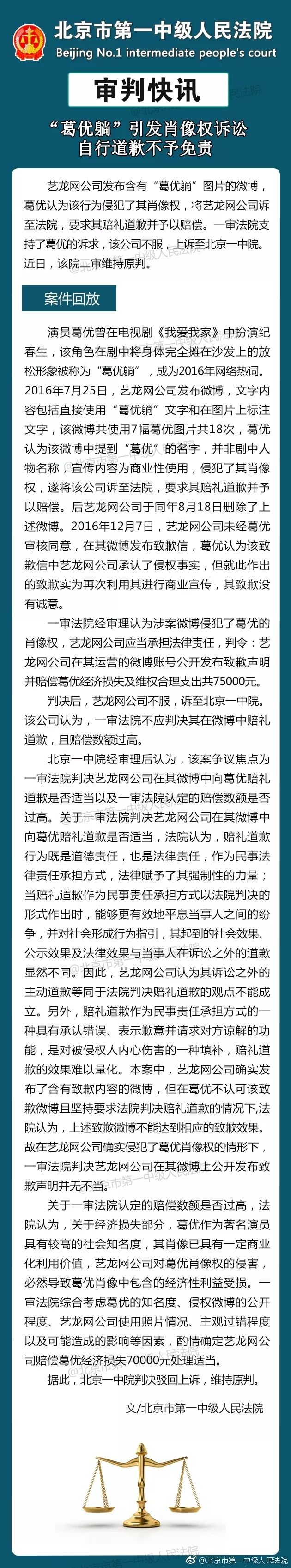 一审法院审理认为,涉案微博侵犯了葛优的肖像权,判令艺龙网公司在其运营的微博账号公开发布致歉声明,并赔偿葛优经济损失及维权合理支出共7.5万元。