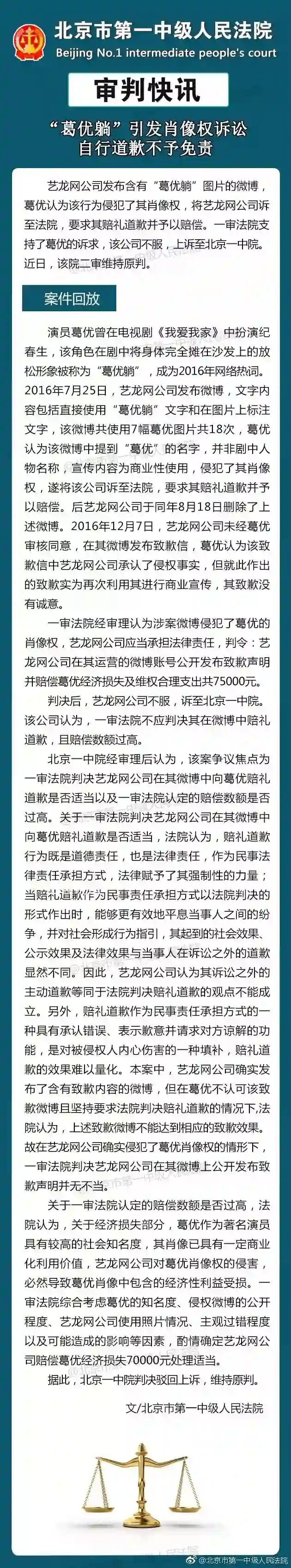 2016年7月25日,艺龙网公司发布微博,文字内容包括直接使用“葛优躺”文字和在图片上标注文字,该微博共使用7幅葛优图片共18次,葛优认为该微博中提到“葛优”的名字,并非剧中人物名称,宣传内容为商业性使用,侵犯了其肖像权,遂将该公司诉至法院,要求其赔礼道歉并予以赔偿。
