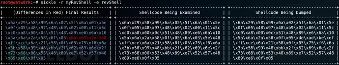 有时你可能想通过自己重建shellcode以了解某个执行流畅的shellceode片段的底层机制。Sickle可以帮助你将原始shellcode与“重建”版本进行差异性比较。