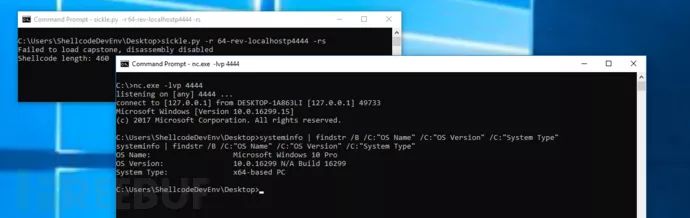 如果你不使用它的反汇编功能,仅仅只是将Sickle作为一个wrapper/dump的工具,那么你可以使用任意版本的Python环境(包括2.7)。这里需要说明的是,我在Windows 10上编写/测试64位shellcode时遇到了一些问题。因此,为了避免大家使用时出现同样的问题,我建议大家安装Python 3.4.4 (amd64) ,但对于其它版本的windows系统并不存在该问题。其次,如果你编写的shellcode为x86,则任意版本的Python都没影响,例如Python 3.7.0a3。以下是在Windows 10主机上测试msfvenom生成的shellcode(“windows / x64 / shell_reverse_tcp”)的用法示例