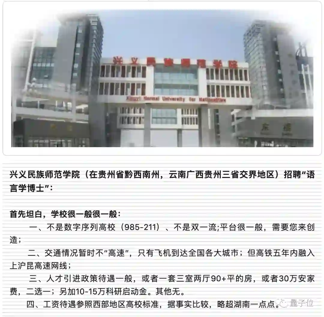 兴义民族师范学院在招聘语言学博士时,完全不忽悠人,一上来就坦白: