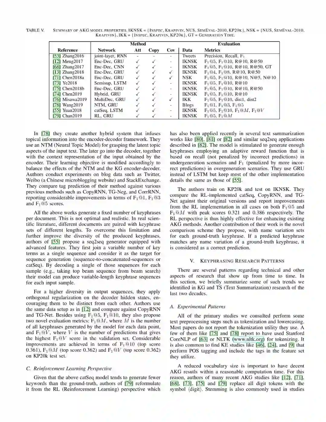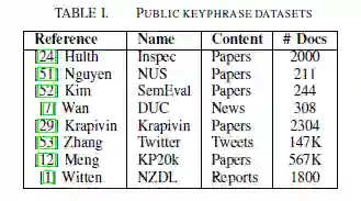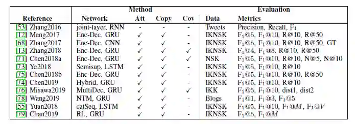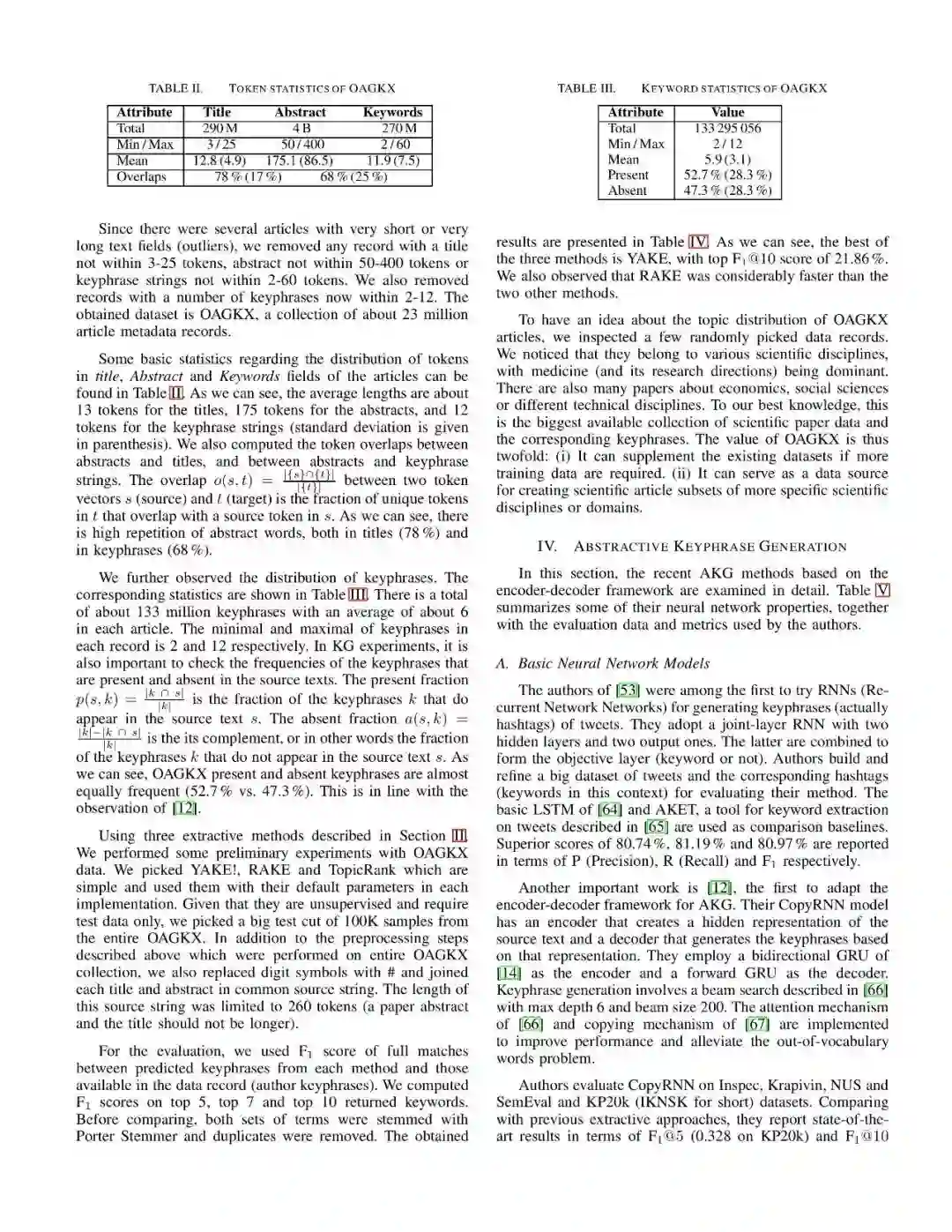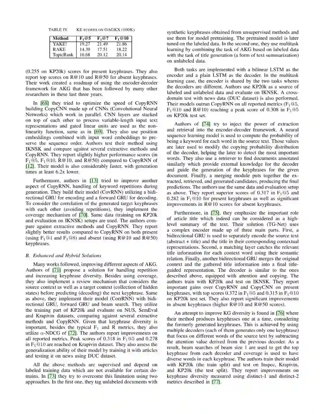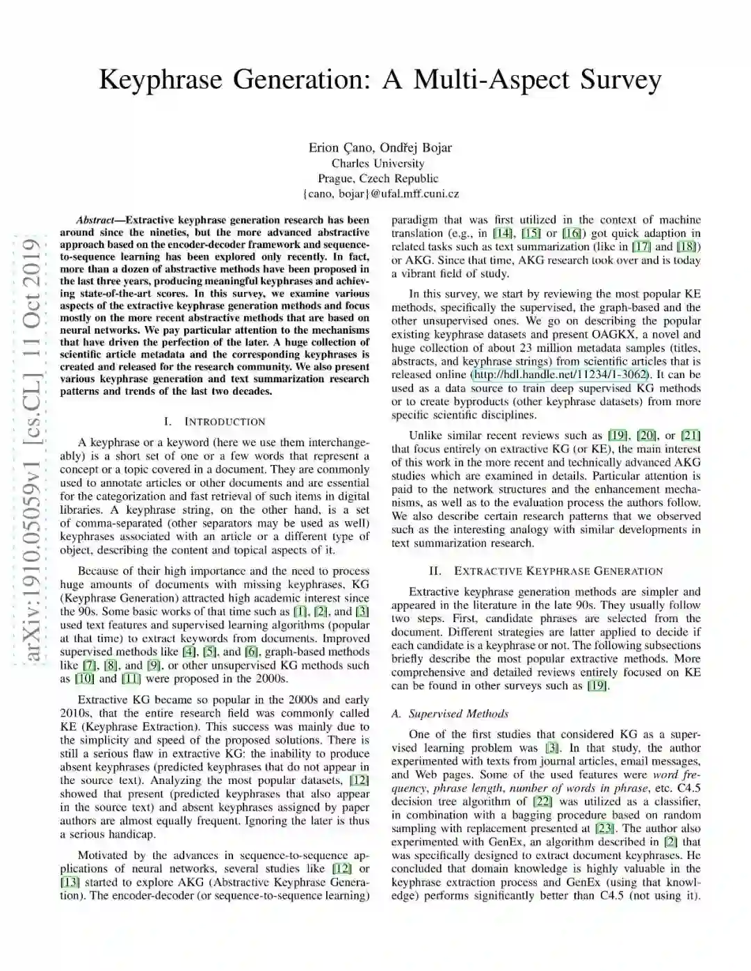 在这篇综述中,我们研究了提取关键词方法的各个方面,其中主要关注基于神经网络的较新的抽象方法。特别地,我们注意到这种机制能够驱动后者变得更加完善。本文还介绍了近二十年来各种关键词生成和文本摘要的研究模式和发展趋势。我们首先会回顾一下最流行的KE方法,特别是有监督的、基于图的和其他无监督的方法。接下来我们会描述目前流行的关键词数据集:OAGKX。这个数据集可以被用作数据源去训练可监督的KG方法或者从更加具体的学科去生成其他副产品。