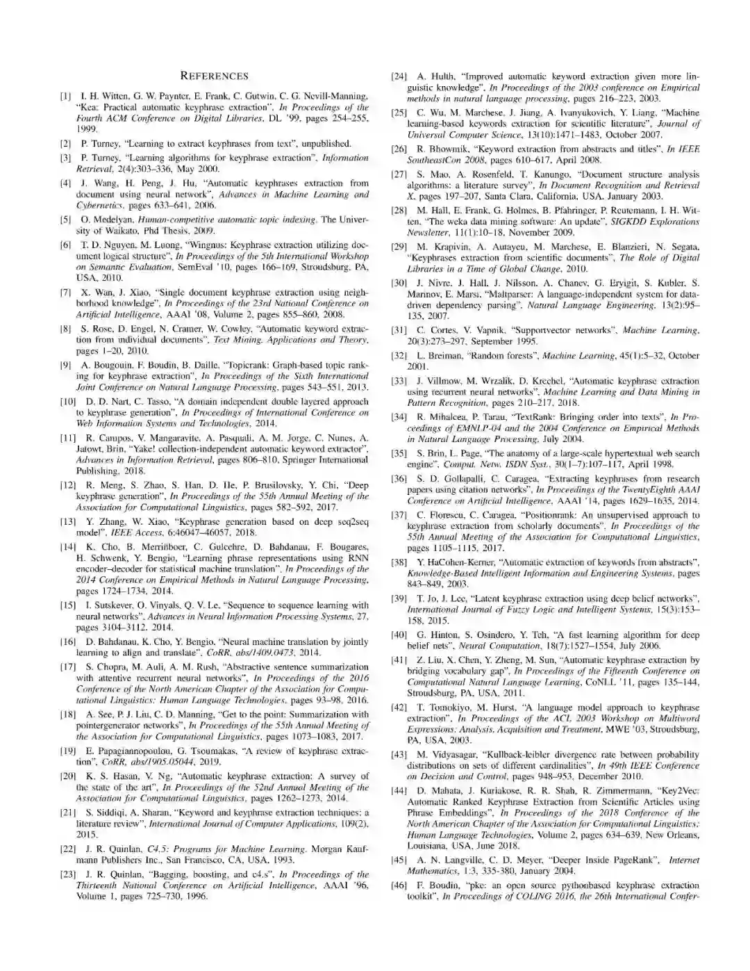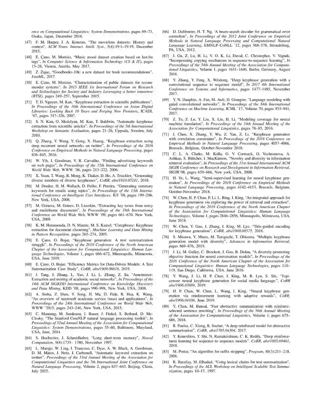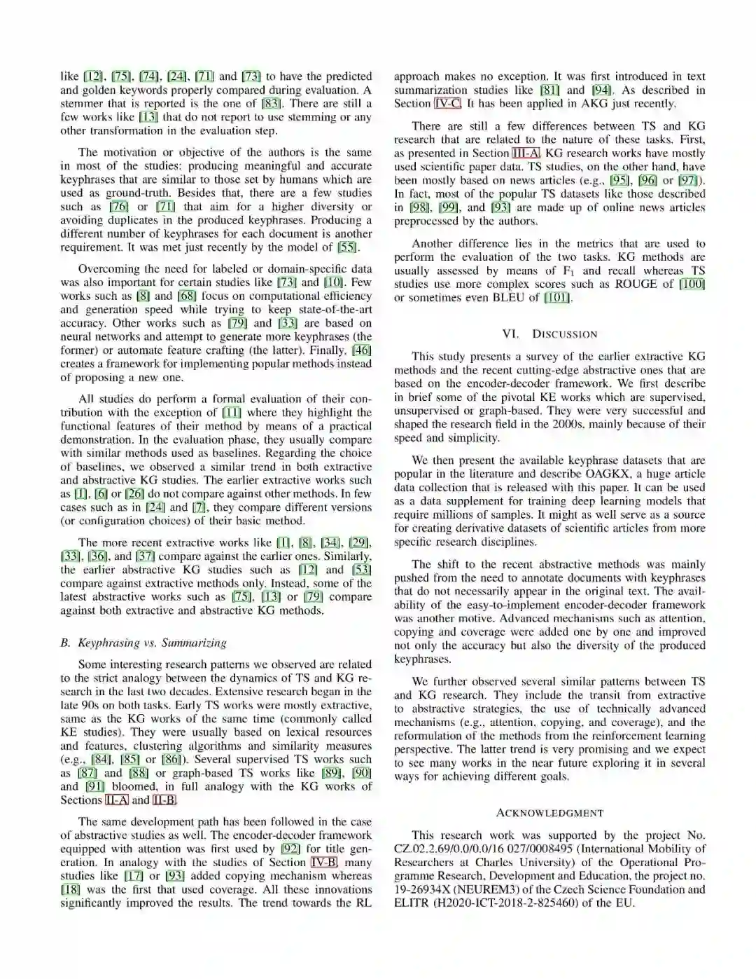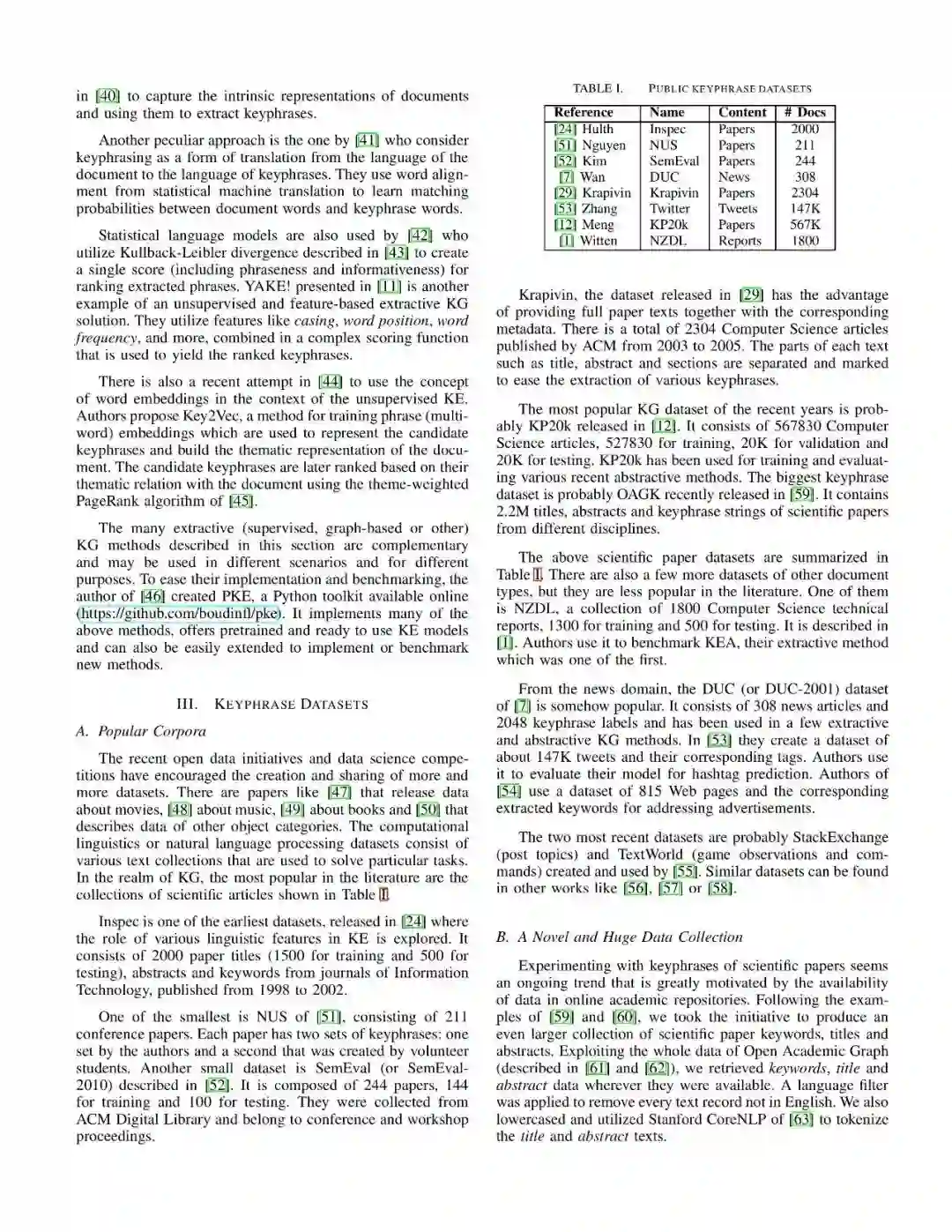 在这篇综述中,我们研究了提取关键词方法的各个方面,其中主要关注基于神经网络的较新的抽象方法。特别地,我们注意到这种机制能够驱动后者变得更加完善。本文还介绍了近二十年来各种关键词生成和文本摘要的研究模式和发展趋势。我们首先会回顾一下最流行的KE方法,特别是有监督的、基于图的和其他无监督的方法。接下来我们会描述目前流行的关键词数据集:OAGKX。这个数据集可以被用作数据源去训练可监督的KG方法或者从更加具体的学科去生成其他副产品。