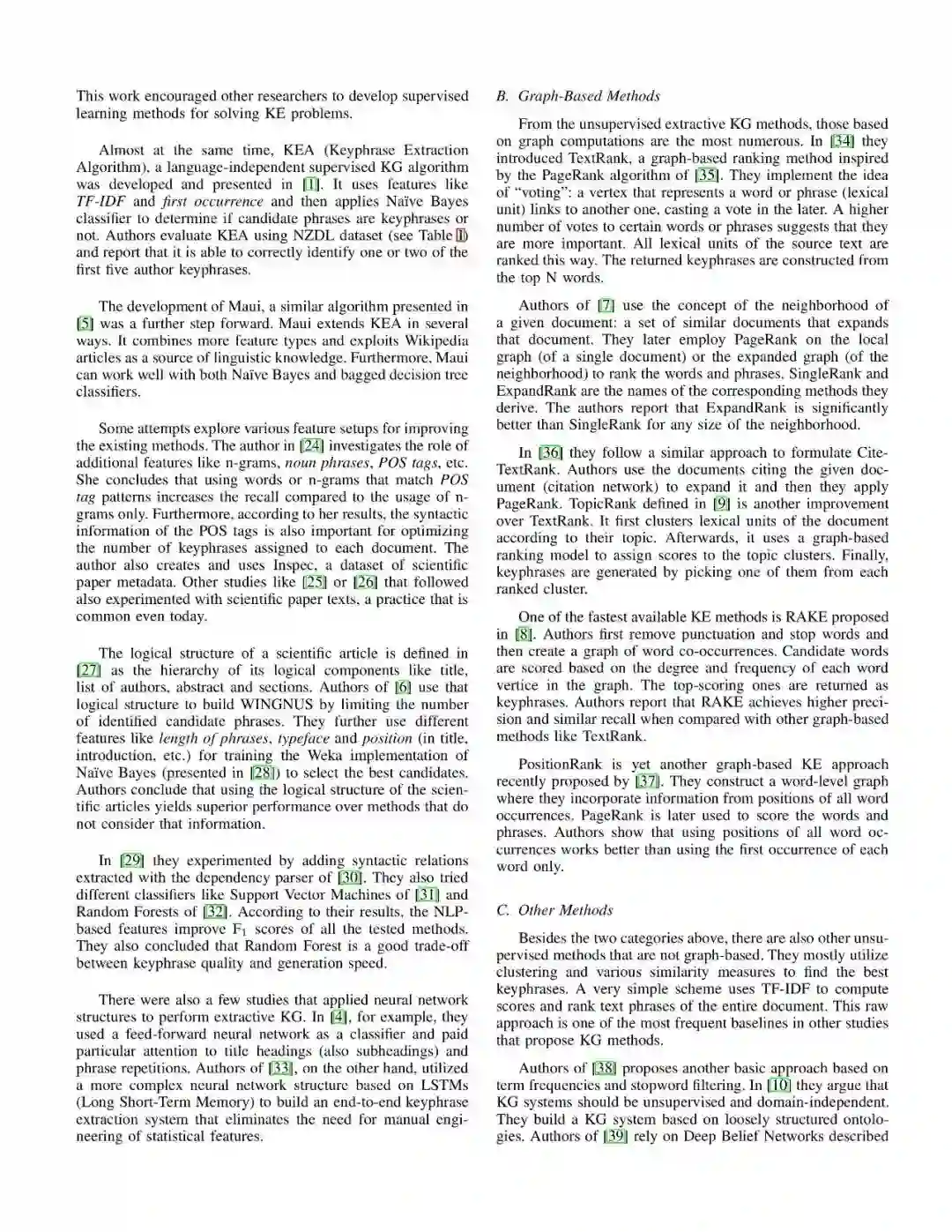 除了上面提到的两类之外,还有一些是无监督的且不基于图的方法。他们中的大多数利用聚类和各种相似性度量来寻找最佳关键字段。如经典的TF-IDF就是计算分数并且对整篇文档的文本短语进行排序。同时,TF-IDF也是在KG方法研究中最常用的baseline之一。