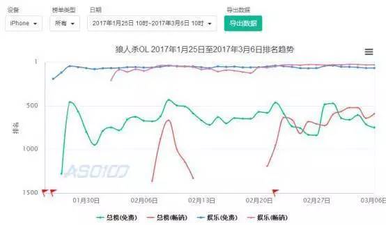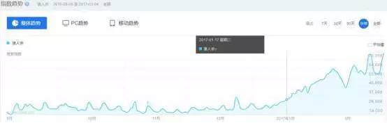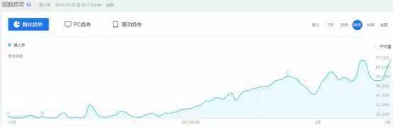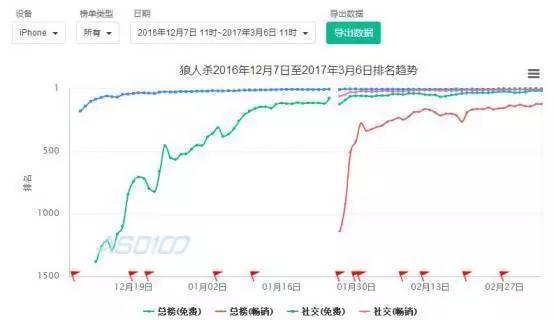 17年1月初开始出现高速增长,狼人杀百度指数由1.6W到2月中旬的5.8W,再到3月4日已到7W+,并且仍处于持续增长中。