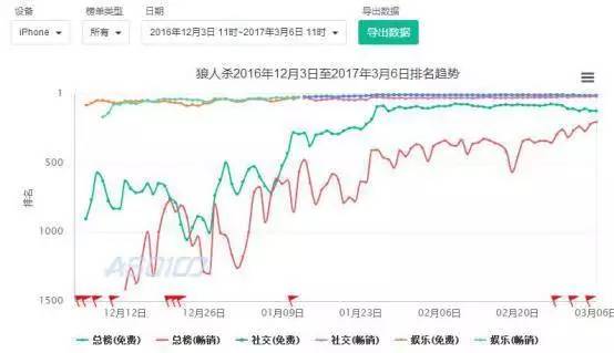 App《狼人杀-有点烧脑》目前IOS免费总榜18(昨日20),社交免费第3(前两个是QQ和微信),于16年12月8日上线,经历12个版本,其榜单变化如下:
