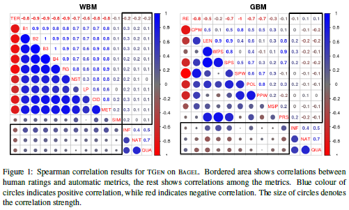 核心内容: 作者针对NLG(nature language generation)自动化评估问题,对于WBMs(Word-based Metrics), GBMs(Grammar-based metrics)两大类总计21个当时常用的评估指标进行了分析,具体是用了3个SOTA模型以及三个属于不同领域的数据集上进行测试,并且将测试结果进一步交由众包平台进行人工打分,进而对自动评估和人工评估进行有效性对比以及关联性分析。同时,对于测试结果进行了模型、数据集、以及具体样本级别的详细错误分析,得出了包括BLEU在内的大部分指标并不能令人满意的结论。