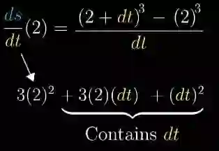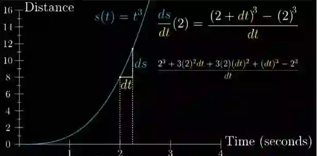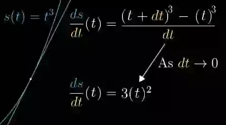 . 求导本来是一个很复杂的过程, 我们要计算微小时间差内的微小距离的变化, 让我们不看时间差具体有多少, 又要让时间差趋近于 0 . 想想就头大, 但是我们最后却得到了一个很简洁的式子 3t2