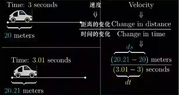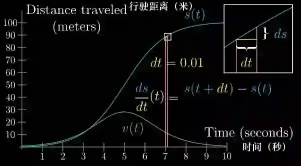 时的值, 减去它在 t 时的值, 也就是计算时间 t 和 再经过 0.01 秒之后的距离差, 然后把这距离差除以时间的变化量 dt