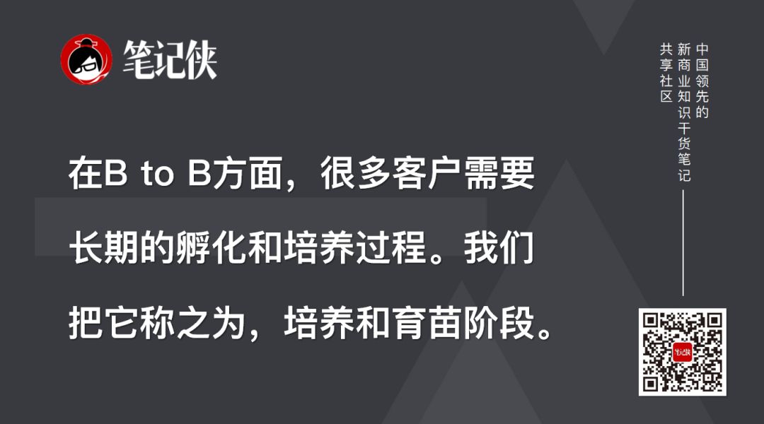 在B to B方面,我们发现,很多客户不是一上来就有购买倾向,需要长期的孵化和培养过程。我们把它称之为,培养和育苗阶段。