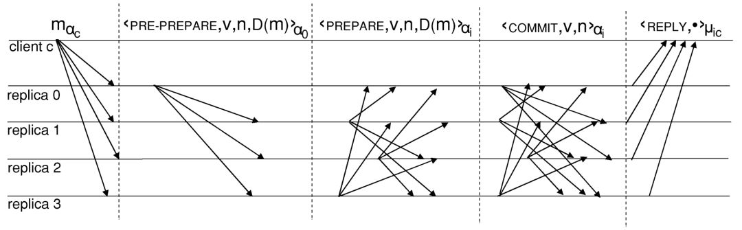 如图所示,从客户端发起请求到收到回复结果,可以分为5个阶段,而共识过程采用了3阶段协议。下面简要叙述5个阶段的大致过程: