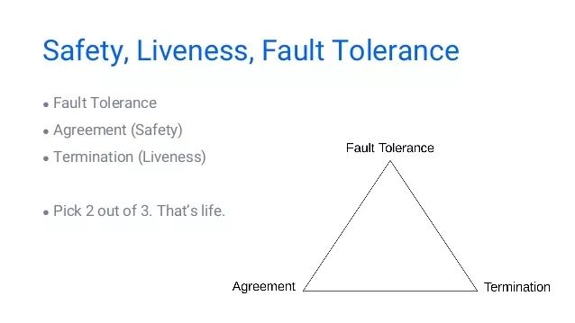 从另一个角度来理解,FLP实际上考虑了分布式系统的3个属性:安全(safety)、活性(liveness)、容错: