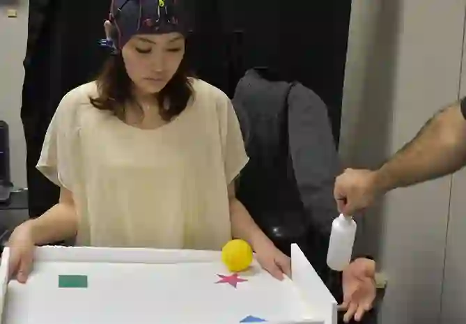 在接下来的试验中,受试者被要求保持相同的姿势,但不同的是是,这次实验环境中多出了一个机械手臂,受试者被要求看着机械手臂并让它抓住旁边的一个瓶子。