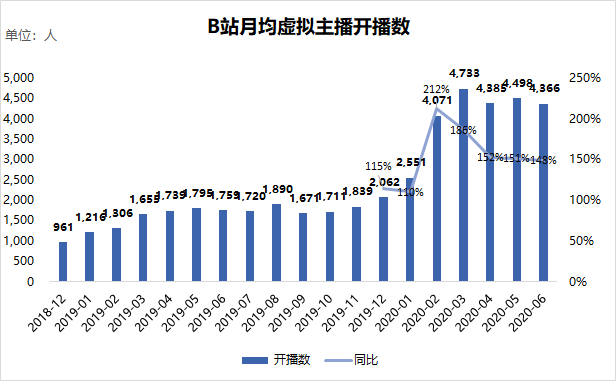 小葫芦的监测数据显示,2020年初至今,B站上每个月约有4000多个虚拟主播开播,过去半年的月均增速都在100%以上。