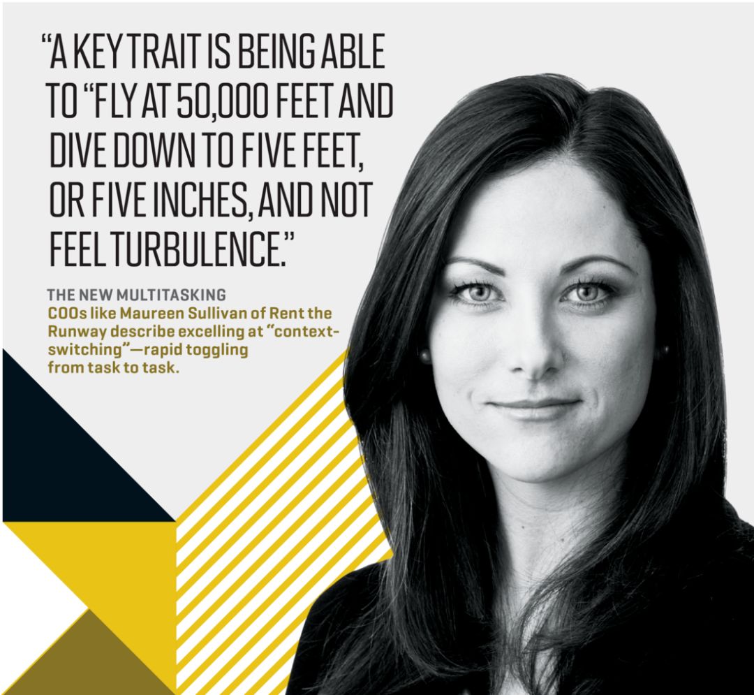 担任公司二把手的首席运营官需要哪些素质?要专注、高效,还要善于学习。他们要特别擅长多任务处理,还有近似的“模式转换”,虽然本质上是单任务模式但要在大量任务之间切换。(“我在模式转换方面堪称一绝。” Stripe公司的约翰逊说。)时尚租赁公司Rent the Runway首席运营官莫林·萨利文表示,最重要的素质是“既能飞上5万英尺高空,又能迅速潜下5英尺甚至5英寸的地面,还得应对自如。”