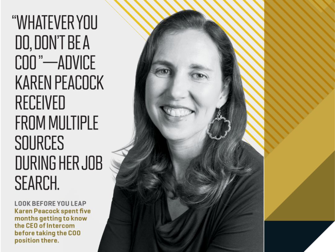 凯伦·皮考克离开Intuit接手创业公司工作时,也有类似顾虑。她在Intuit担任高级副总裁,手下超过500名员工,负责25亿美元的小企业部门业务,包括QuickBooks品牌。找工作时她咨询的好几位顾问给出了同样的建议:“不管以后做什么,千万别当首席运营官。”顾问团认为皮考克已经可以胜任首席执行官,事实上她也确实有几份类似工作邀请。但她也在考虑首席运营官的机会,考虑过程中她仔细研究了这一职位可能遇到哪些问题。