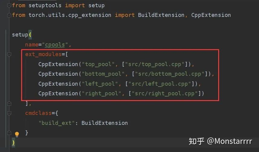 这一部分基本上算是一个固定的格式针对不同的问题需要修改的地方就是ext_modules参数,这里面根据实际的需要列表中可以存在多个CppExtension模块,也就是说可以同时编译多个C++文件。