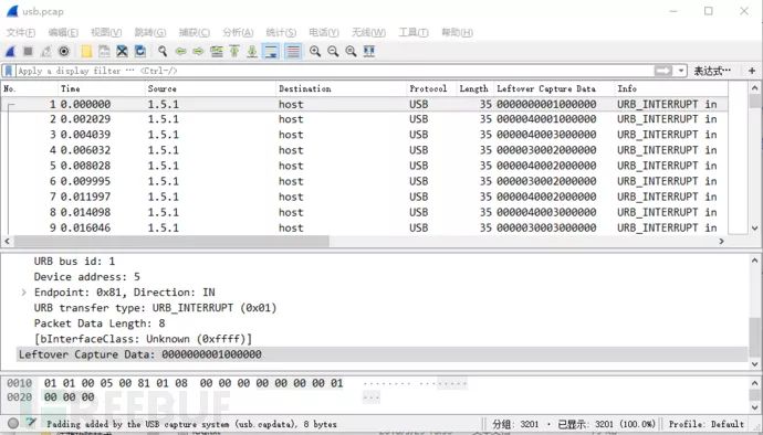 假设有一段流量,协议是usb,我用wiresharp打开这个包,可以看到里面的字段和内容: