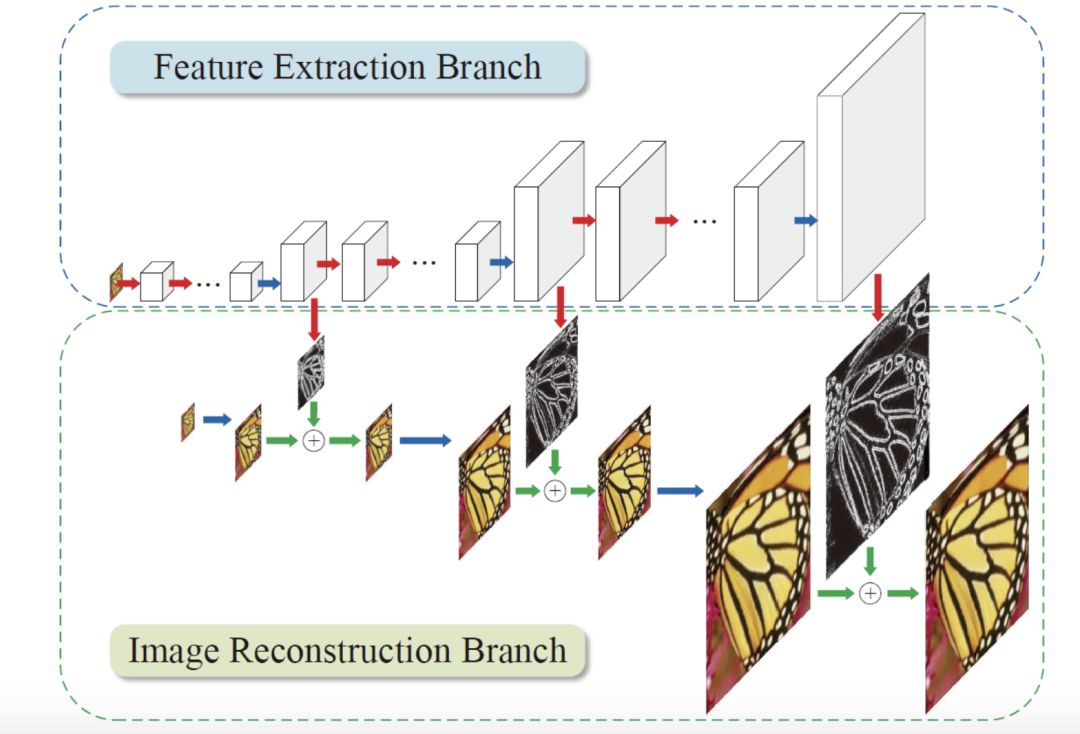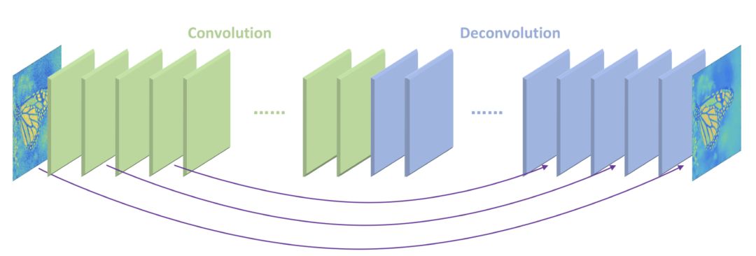 每一个卷积层都对应一个非卷积层。简单来讲,可以理解为是将一张图片进行了编码,然后紧接着进行解码。它的优势在于解决了梯度消失的问题,而且能恢复出更干净的图片。它和 VDSR 有相似的思路。中间卷积层与反卷积层的训练是针对原始图片与目标图片的残差。最后原图会与训练输出结果相加,得到高分辨率的图片。