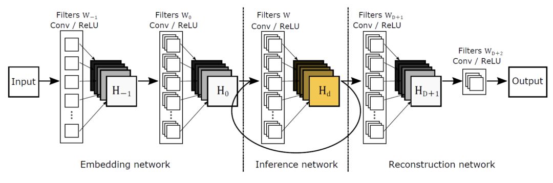 它还是分为三层。但是在非线性映射这一层,它使用了一个递归网络,也就是说,数据循环多次地通过该层。将这个循环展开的话,等效于使用同一组参数的多个串联的卷积层。