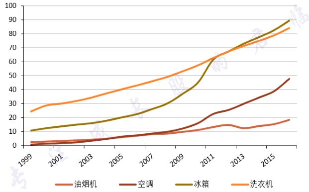 2016年,我国农村每百户吸油烟机保有量仅为 18 台,远低于冰箱每百户保有量90台。