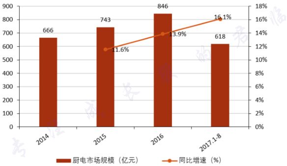根据业内数据,2014-2016 年,我国厨电市场规模年均增速超过 10%,2017 年达到 968 亿元,同比增长 14.8%。