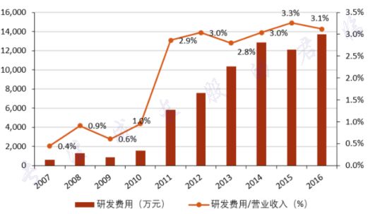 自2011年开始,华帝的研发投入占比开始大幅攀升,从早期的百分之零点几,提升到了3%左右。