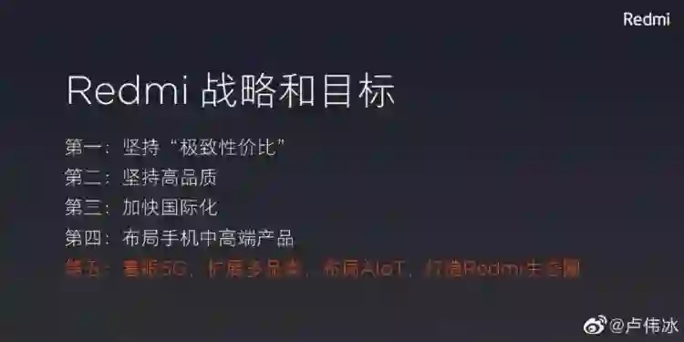 Redmi 品牌并非单纯提供低价产品,在小米集团副总裁兼红米 Redmi 品牌总经理卢伟冰公布的 Redmi 五条战略和目标里,“极致性价比”被放在了第一位。