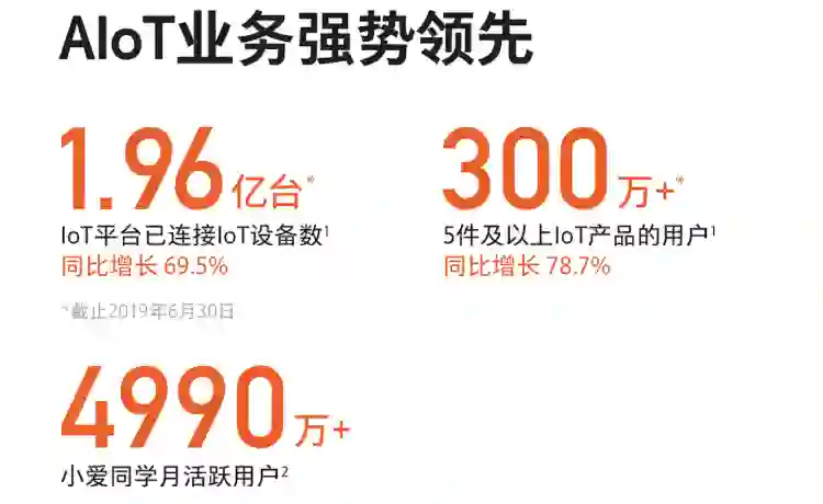 不过截止 2019 年 6 月 30 日,小米 IoT 平台已连接的 IoT 设备数(不包括智能手机及笔记本计算机)达 1.96 亿台,同比增长 69.5%。