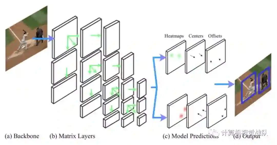 (c):使用了共享输出子网络,而针对每个矩阵层,预测了左上角和右下角的热图和偏移量,并在目标层内对它们进行中心点预测;