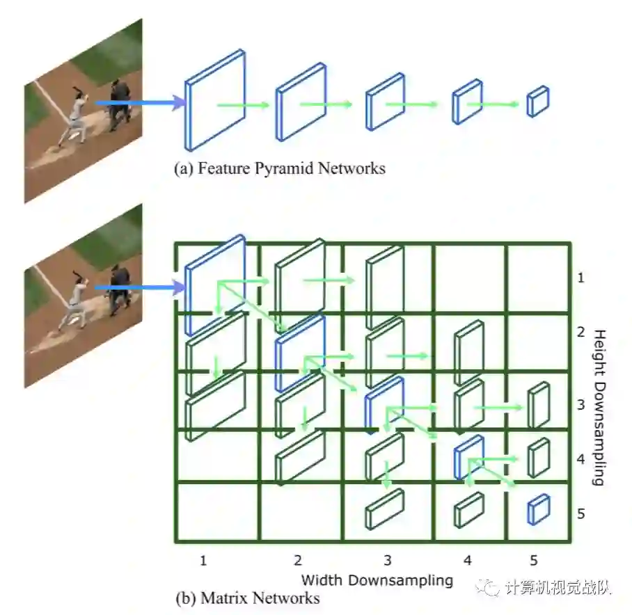 下图所示为Matrix nets(xNets),使用分层矩阵建模具有不同大小和丛横比的目标,其中矩阵中的每个条目i、j 表示一个层 li,j,矩阵左上角层 l1,1 中宽度降采样2^(i-1),高度降采样2^(j-1)。对角层是不同大小的方形层,相当于一个 FPN,而非对角层是矩形层(这是xNets所特有的)。 层l1,1是最大的层,每向右一步,层宽度减半,而每向下一步高度减半。