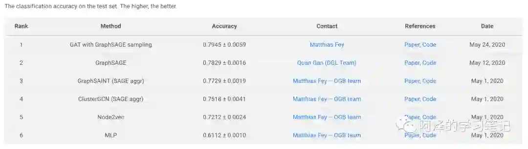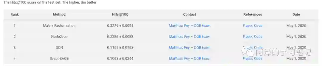 OGB 也提供了标准化的评估人员和排行榜,以跟踪最新的结果,我们来看下不同任务下的部分 Leaderboard。