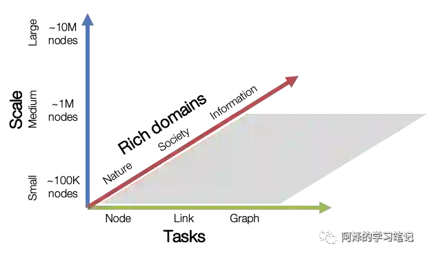 下图展示了 OGB 的三个维度,包括任务类型(Tasks)、可扩展性(Scale)、领域(Rich domains)。