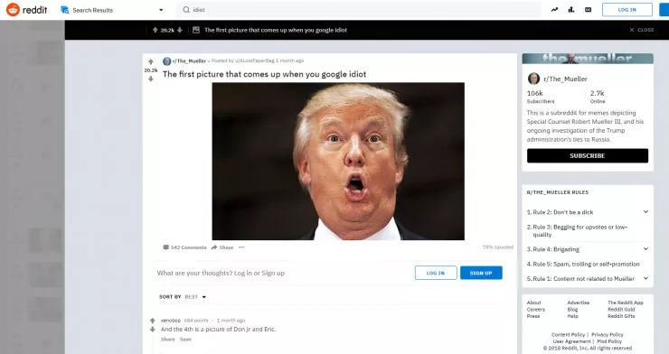 据外媒报道,这样的结果是美国网友动的手脚。美国版天涯“Reddit”的网友们,他们将大量的川普照片标注为“idiot”,并号召吧友在带有这些内容的帖子上点赞,成为Reddit的热门帖子,从而影响谷歌搜索结果。