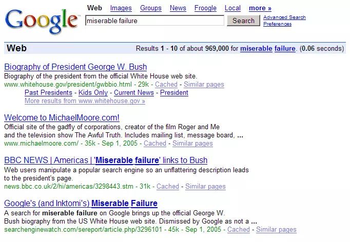 2004年,在美国总统大选期间,小布什再次受到谷歌炸弹的攻击,网友们将“Miserable failure”(悲惨失败)与小布什的白宫主页的搜索结果相连。