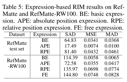 由于本文在任务中引入了不同类型的表达式,因此可以看到每种类型对抠图性能的影响。如上表所示,在 RefMatte 测试集上测试了性能最好的模型 CLIPMat,在 RefMatte-RW100 上测试了模型 MDETR。
