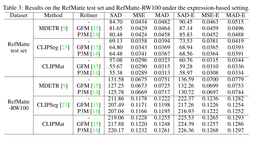 作者还在 RefMatte 测试集和 RefMatte-RW100 的基于表达式的设置下评估了这三种方法,并在上表中显示了定量结果。CLIPMat 再次在 RefMatte 测试集上表现出良好的保留更多细节的能力。在 RefMatte-RW100 上进行测试时,像 CLIPSeg 和 CLIPMat 这样的单阶段方法落后于两阶段方法,即 MDETR,这可能是由于 MDETR 的检测器在理解跨模态语义方面的能力更好。