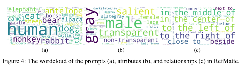 作者还在上图中生成了 RefMatte 中的提示、属性和关系的词云。可以看出,数据集有很大一部分人类和动物,因为它们在图像抠图任务中非常常见。RefMatte 中最常见的属性是男性、灰色、透明和显着,而关系词则更加平衡。