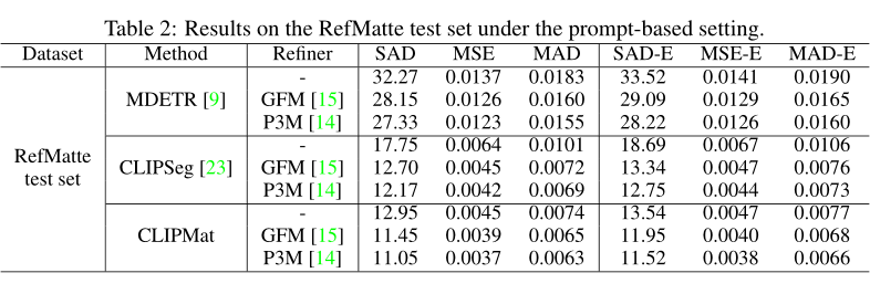 作者在 RefMatte 测试集的基于提示的设置上评估 MDETR 、CLIPSeg和 CLIPMat,并将定量结果显示在上表中。可以看出,与 MDETR 和 CLIPSeg 相比, CLIPMat 表现最好,无论是否使用抠图精炼器,验证添加抠图头为 RIM 任务自定义 CLIPSeg 的有效性。此外,使用两种抠图细化器中的任何一种都可以进一步提高三种方法的性能。