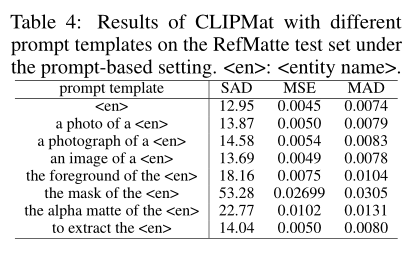 为了调查提示输入形式的影响,作者评估了不同提示模板的性能。除了 使用的传统模板外,作者还添加了更多专门为图像抠图任务设计的模板,例如 the foreground/mask/alpha matte of <entity name>。结果如上表所示。可以看到 CLIPmat 在不同提示下的性能差异很大。